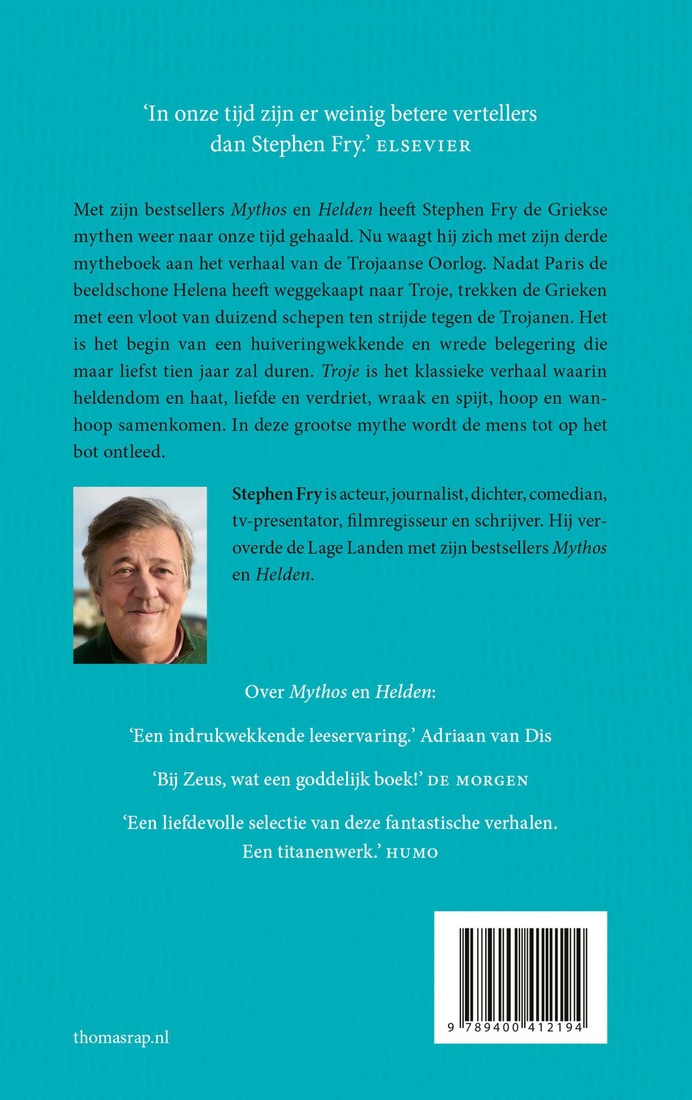 Met zijn bestsellers Mythos en Helden heeft Stephen Fry de Griekse mythen weer naar onze tijd gehaald. Nu waagt hij zich met zijn derde mythe-boek aan het verhaal van de Trojaanse Oorlog. Nadat Paris de beeldschone Helena heeft weggekaapt naar Troje, trekken de Grieken met een vloot van duizend schepen ten strijde tegen de Trojanen. Het is het begin van een huiveringwekkende strijd, een wrede belegering, die maar liefst tien jaar zal duren. Troje is het klassieke verhaal waarin heldendom en haat, liefde en verdriet, wraak en spijt, hoop en wanhoop samenkomen. In deze grootse mythe wordt de mens tot op het bot ontleed.