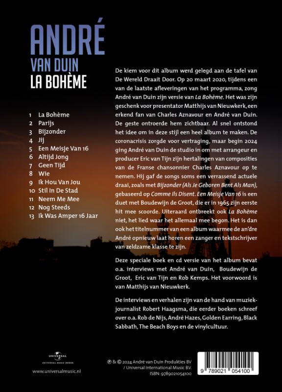La Bohème van André van Duin verschijnt in speciale boekvorm met cd en bevat 13 klassiekers van Charles Aznavour. Wie is er niet met hem groot geworden? André van Duin groeide uit tot de meest geliefde komiek van Nederland. Zijn revues, tv-shows, typetjes en vele Top 40-hits behoren tot ons nationale erfgoed en staan in het geheugen van generaties gegrift. Maar de gekke petjes en grote schoenen, zoals hij het zelf noemt, blijven tegenwoordig in de kast. Op La Bohème vertolkt Van Duin door hem zelf in het Nederlands hertaalde klassiekers van de wereldberoemde chansonnier Charles Aznavour. Nummers als Jai vu Paris, She en natuurlijk La Bohème. Auteur Robert Haagsma sprak voor dit boek met onder andere André zelf, producer Eric van Tijn, Boudewijn de Groot en chansonkenner Rob Kemps. Daarnaast bevat het boek de verhalen achter de nummers op het album, en de biografieën van zowel André van Duin als Charles Aznavour.