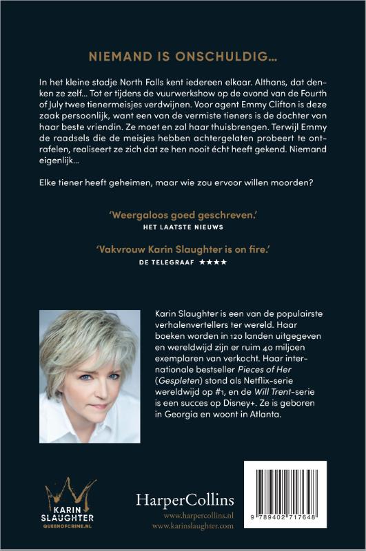 ‘Karin Slaughter wordt niet voor niets de Queen of Crime genoemd. Haar razendsnelle thrillers zijn ijzingwekkende breinbrekers, bulken van de gedegen research en haar protagonisten zijn altijd psychologisch sterk onderbouwd.’ Knack
